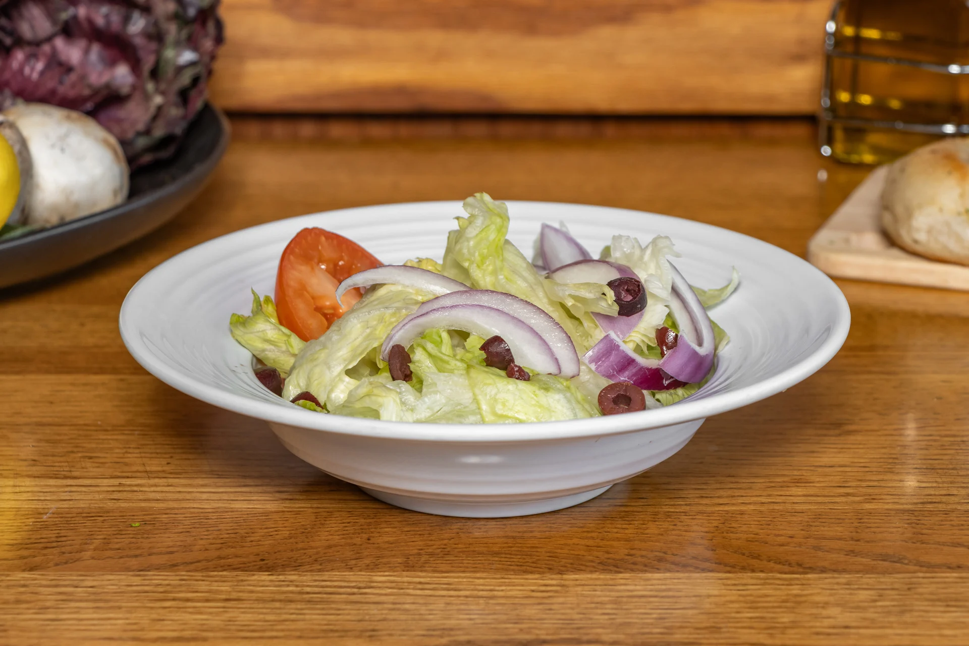Garden salad consisting of lettuce, kalamata olives, red onions, and tomatoes, topped with your choice of dressing.