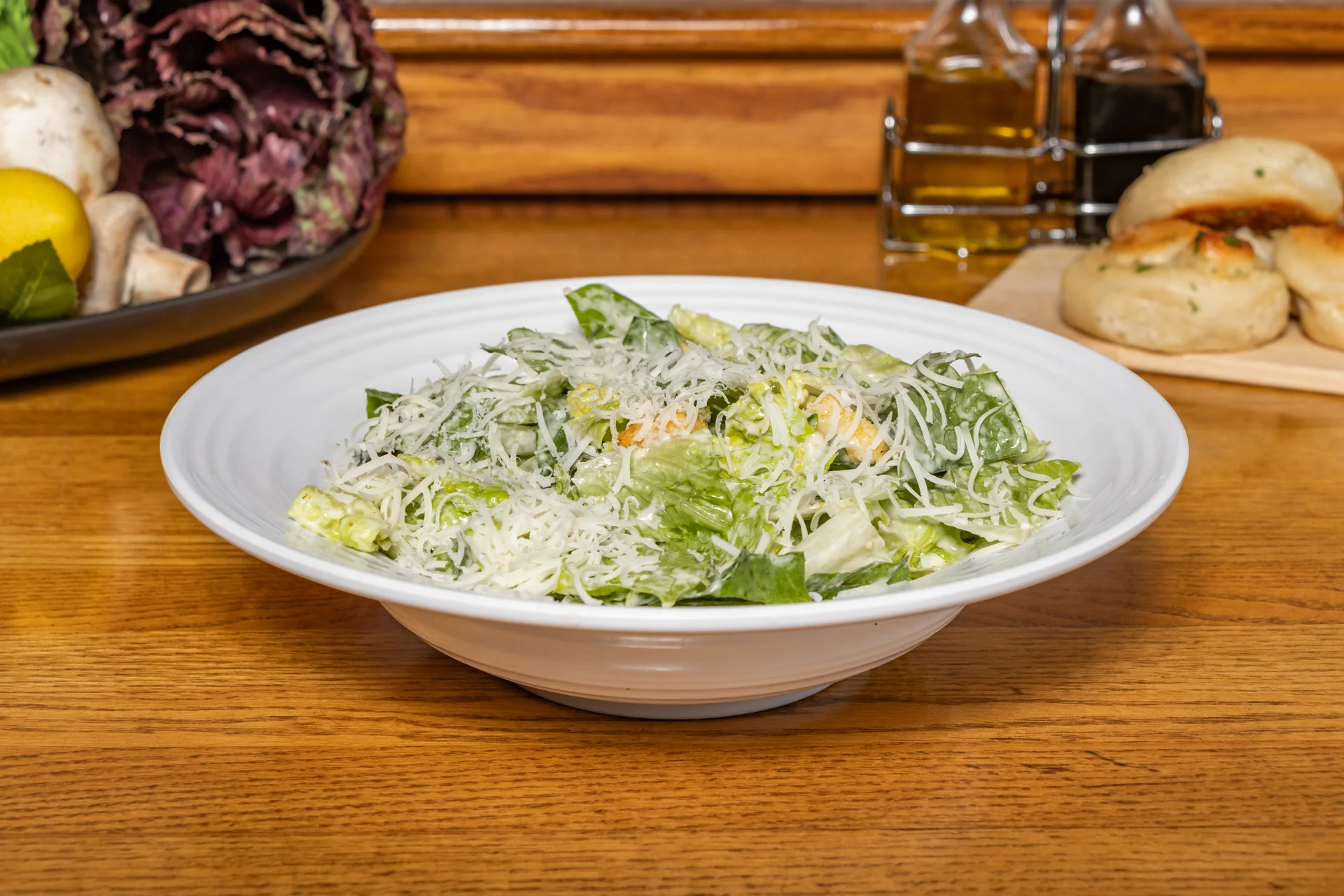 Romaine lettuce tossed in caesar dressing, topped with fresh parmesan cheese and croutons.