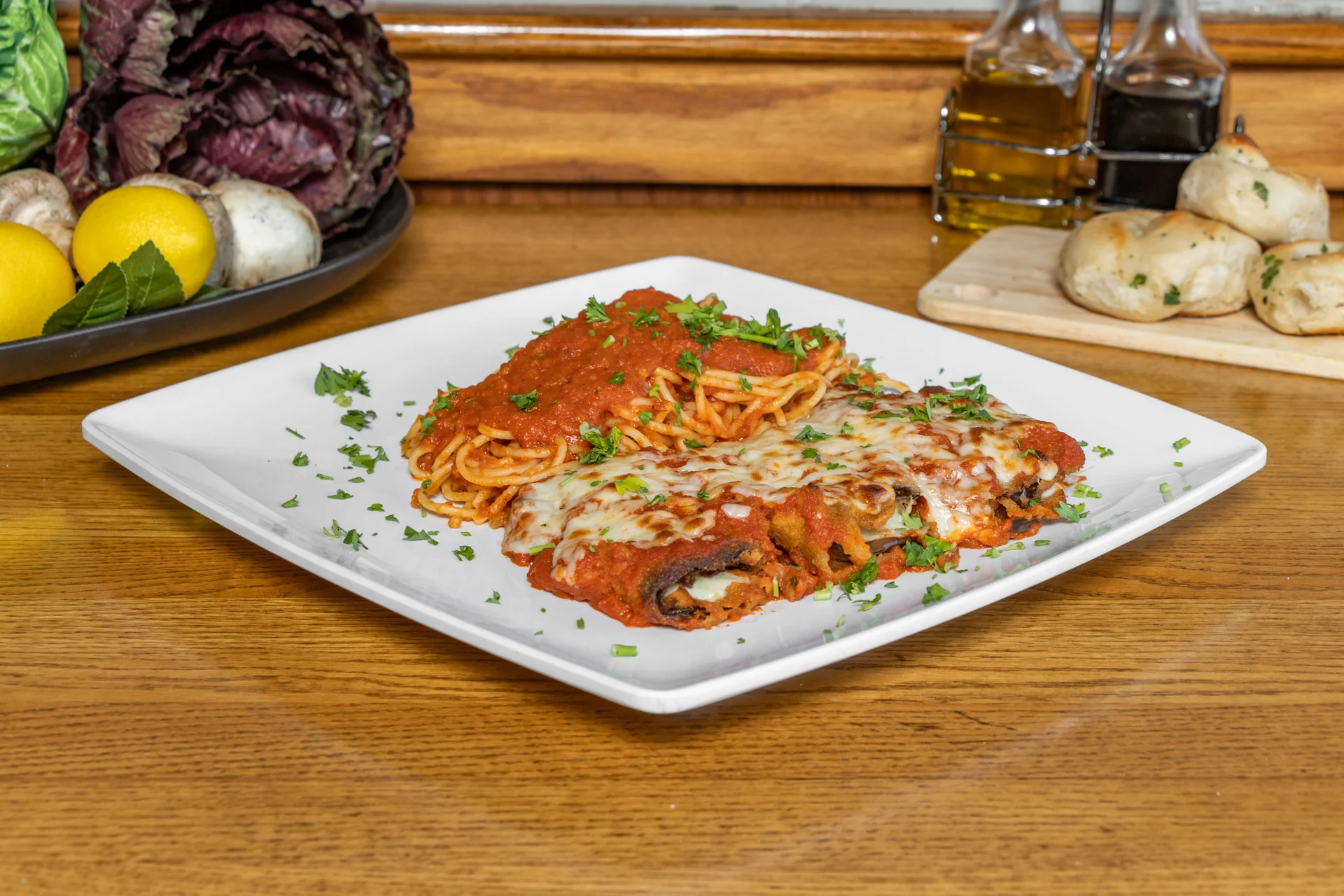 Eggplant breaded, topped with marinara sauce and melted mozzarella cheese, served with spaghetti.