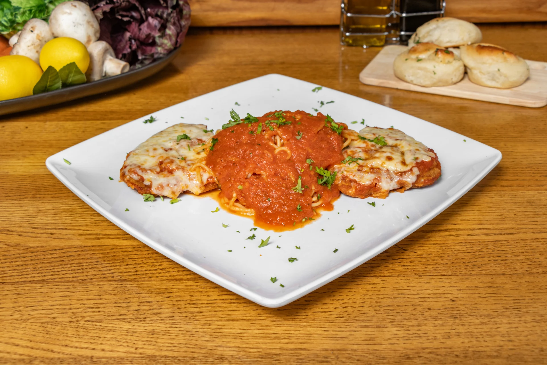 Breaded chicken topped with melted mozzarella cheese and baked with homemade marinara sauce, served with spaghetti.